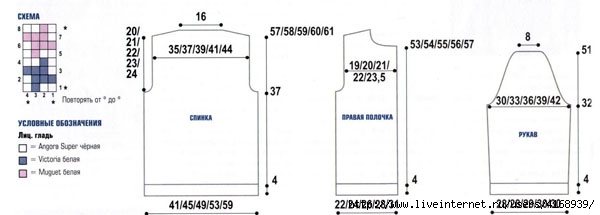 Перед: набрать 112/122/132/142 п. нитью Angora + Tresor на спицы № 3,5, связать 4 р. платочной вязкой. Далее вязать жаккардовым узором, начиная с 3-го р. и 4-й/6-й/8-й/10-й п. схемы, равномерно прибавив в 1-м р. 20/22/24/26 п. = 132/144/156/168 п. В то же время закрыть с обеих сторон в каждом 20-м р. 2 х 1 п., в каждом 18-м р. 3 х 1 п. = 122/134/146/158 п. Через 41 см от наборного края закрыть с обеих сторон для пройм в каждом 2-м р. 2 х 3 п., 3 х 2 п., 4 х 1 п./1 х 4 п., 2 х 3 п., 3 х 2 п., 3 х 1 п./2 х 4 п., 2 х 3 п., 3 х 2 п., 2 х 1 п./2 х 4 п., 3 х 3 п., 3 x 2 п., 2 x 1 п. = 90/96/102/108 п.