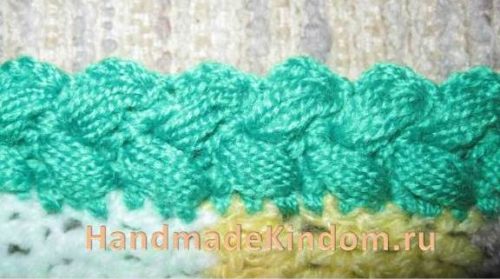 Так как сам плед состоит из объёмного узора, то и для его обвязки я выбрала тоже объёмный, в виде косички из пышных столбиков.