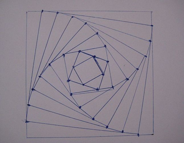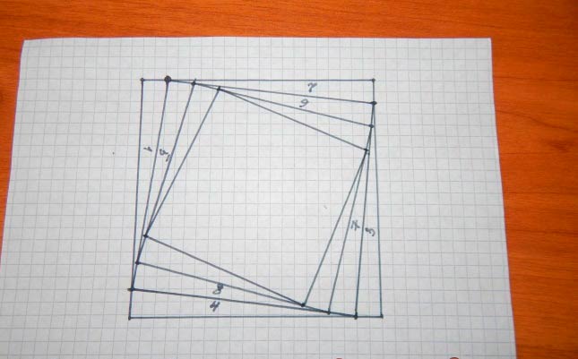 - Нарисовать на листе квадрат. Затем отступить от одного угла 2 клетки и поставить точку. Таким образом делают с каждым углом по часовой стрелки. Точки соединить – получится второй квадрат со смещенными углами.