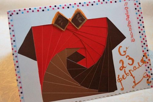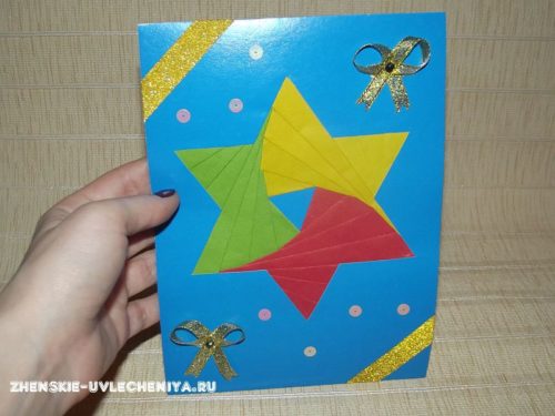 - Открытку переворачивают, лицевую часть декорируют по желанию и своему усмотрению, а изнаночную заклеивают однотонной бумагой.