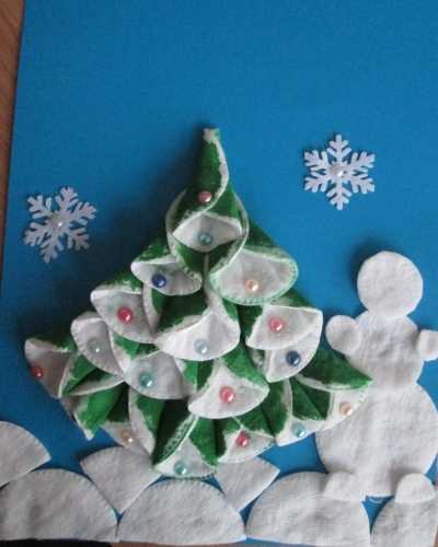 Предварительно сверните каждую деталь (диск, окрашенный зеленой гуашью) в кулечек. Закрепите фигуру клеем и оформите по контуру схемы ели. Затем на фон аппликации поэтапно наклеиваются все элементы. Завершающий штрих — оформление разноцветными английскими булавками, которые добавят картинке праздничного настроения. Для детей проще делать украшение своими руками, наклеивая обычные бусинки. Улыбку снеговика нарисуйте фломастером.