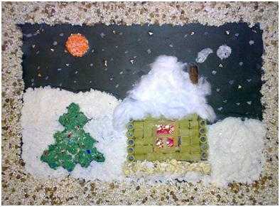 Зимний домик отделайте ватой и на сложных аппликациях, которые выполняются с детьми в подготовительной группе. Такие работы предполагают использование разнообразных текстур (макароны или крупы, мелкой стеклянной крошки):