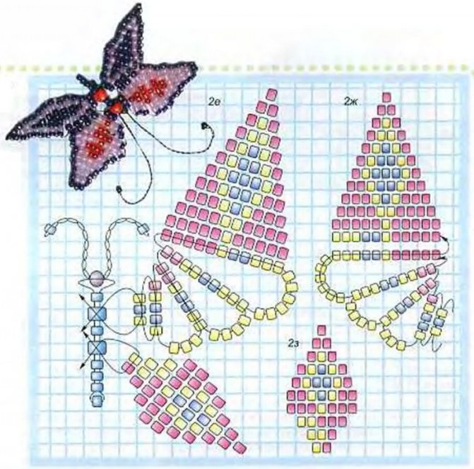 Бабочку можно выполнить следующими способами: кирпичным плетением и мозаикой по кругу. В схемах кирпичного плетения бабочек бусинки располагаются в одну линию, соединитель идет петлями через дырочки. Притом каждый ряд, как в кладке кирпичей, смещается на половину бусинки.