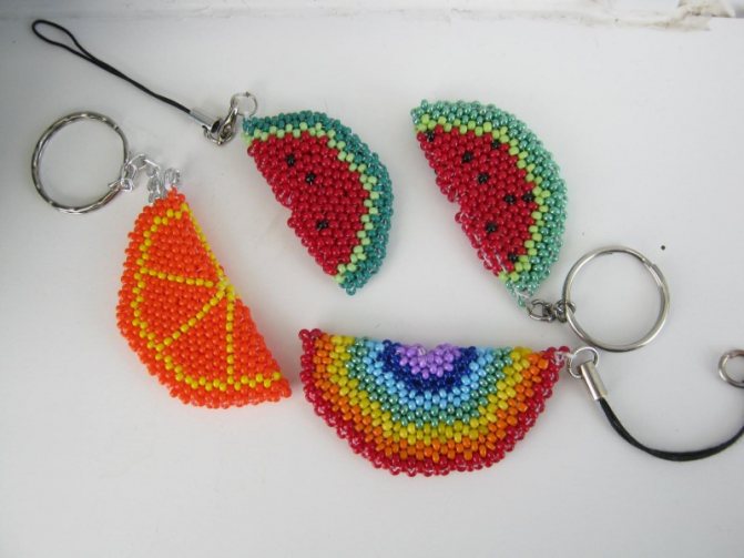 Чтобы преобразить вещи, которые у вас всегда под рукой, лучше сделать брелоки из цветного материала. Это могут быть знаки зодиака, разные зверушки, ягодки, пауки. Для начинающих умельцев будет проще остановить свой взор на аксессуарах, смастеренных в один ряд. К примеру, можно взять за основу инструкцию плетения брелока «Апельсиновая долька»: