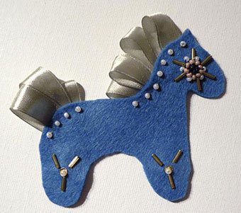 - Аккуратно прикрепите при помощи специального клея пластик к задней части лошади. На этом этапе следует быть очень аккуратным, так как излишки клея могут испортить нежную ткань. Когда клей высохнет, для большего закрепления, пришейте булавку к фетру и пластиковой части.