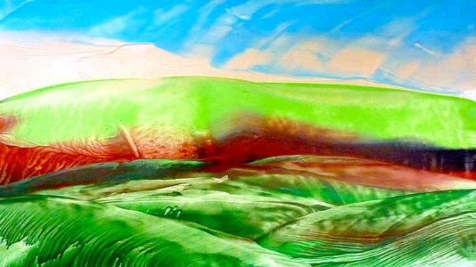 Утюг с рисунком прикладывается к поверхности-основе и будто утюжит ее, оставляя восковой оттиск. Техника энкаустика уникальна тем, что можно создавать причудливые пейзажи, формы и цвета, не прибегая к помощи привычной кисточки. Одно плавное движение утюгом – и на картине остаются горы или лепестки. Изобразить изгибы и линии, нарисовать травинки и пену на волнах можно, проведя по воску горячим носиком или ребром утюга. С его же помощью легко смешать воск разных цветов, создавая интересные сочетания. Оставьте пастель высохнуть, и через полчаса шедевр готов.