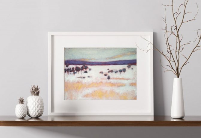 Если нужно растушевать краску, примените для этого кусочек ткани или губку. Чтобы горы окружала зелень, изобразите ее при помощи мелка такого цвета. Нарисуйте другие элементы картины, после чего можно окантовать её в рамку.