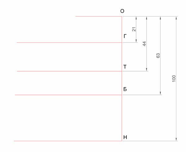 От правого верхнего угла отступаем вниз 10 см, затем влево 5 см, отмечаем точку (∙) О. Проводим прямую вниз. По ней откладываем ОГ = ВПр З + П = 21 см; ОТ = ДТС = 44 см; ОБ = ВБ = 63 см; ОН = ДИ = 1000 см.