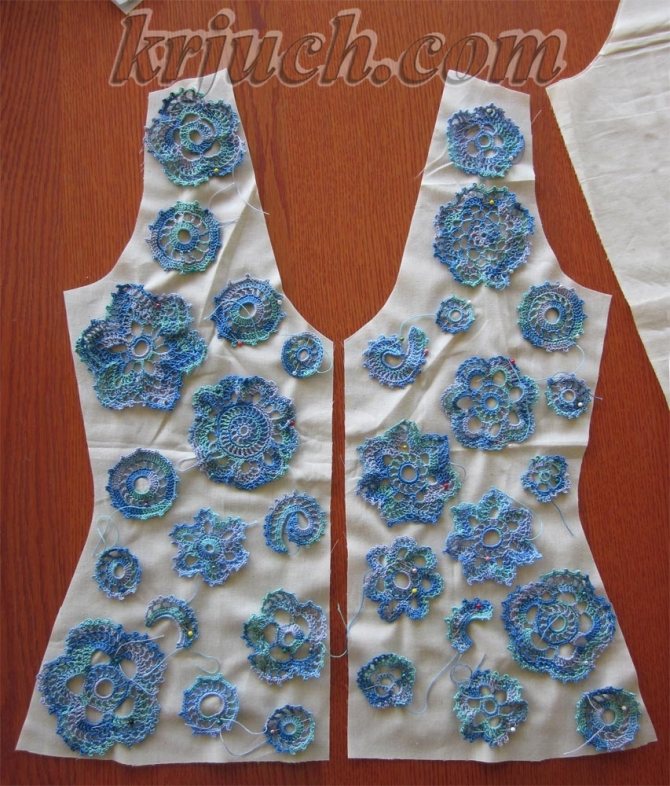Подготовленные мотивы помещаются на выкройку, размещенную на подложке из поролона, и фиксируются портновскими булавками, чтобы полотно не сминалось. Они выкладываются лицевой стороной вниз.