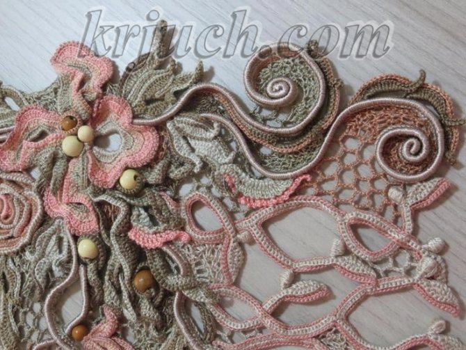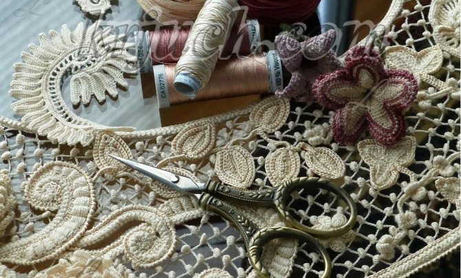 или его детали – перед, спинку, рукава, а потом соединяем, то есть работаем как при шитье. В ирландском кружеве мы не создаем полотно сразу: здесь сначала выполняются отдельные мотивы – обычно цветы или геометрические узоры, и лишь после этого мы соединяем их в единое полотно. В таком подходе есть и свои плюсы, и минусы.