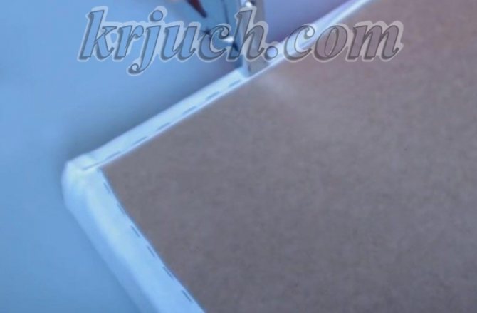 - Переворачиваем основой вверх, закрепляем на ней ткань. Удобнее всего это делать мебельным степлером. Не забываем подвернуть краешки ткани внутрь, чтобы получилось аккуратно. Крепим сначала в центре стороны, потом по уголкам, а уже потом по всей длине. Ткань у нас должна быть немного натянута.