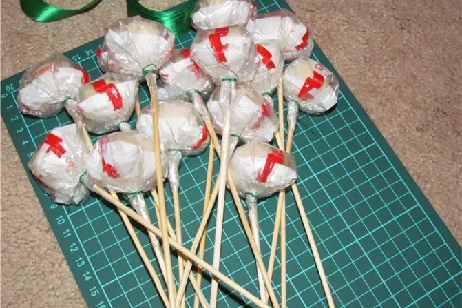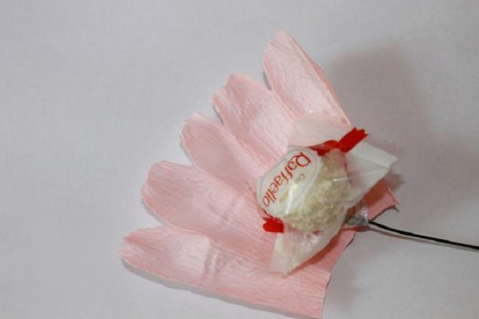 Лепестки из любого материала нужно плотно примотать к черенку у основания конфеты. Соединение можно украсить чашелистиками из тёмно-зелёной гофрированной бумаги и примотать тейп-лентой.