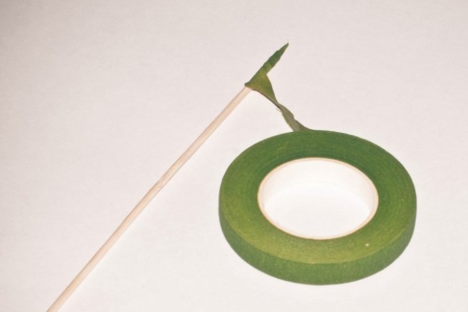 3. Шпажки можно обмотать тейп-летной, если упаковка букета просвечивается. Тогда они будут похожи на черенки живых цветов. Также можно при помощи этой ленты сращивать две шпажки, проволоку со шпажкой и т.д.