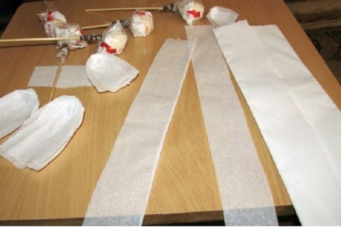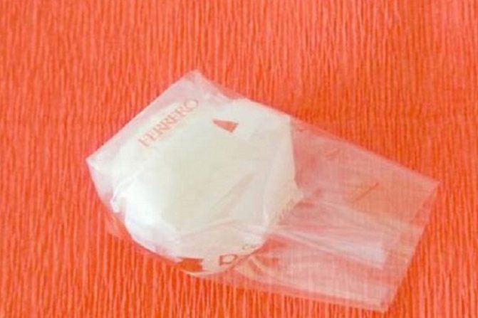Любой букет составляется из отдельных цветов. У нас их роль будут играть конфеты, изначально не снабжённые подобием черенка. Также у «Рафаэлло» красивая обёртка каждой конфетки не имеет даже отдалённого сходства с лепестками. Конечно, на цветочек похожа маленькая бумажная корзиночка внутри упаковки, однако из-за неё не стоит обнажать кондитерские изделия, усыпанные тёртым кокосом. Это не гигиенично и приводит к осыпанию кокосовой стружки. Поэтому наша задача – сделать из каждой конфеты подобие цветка. Чтобы собрать букет из «Рафаэлло» своими руками, пошаговое фото подскажет нам, с чего начать и чем продолжить.