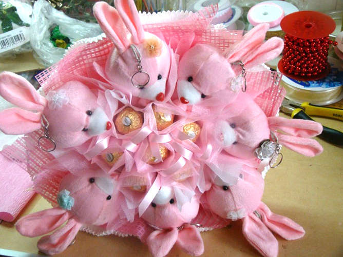 Дополнять композиции можно стразами, бусами, фигурками, искусственными или живыми цветами, конфетами и сладостями. Любое флористическое дополнение подойдёт. Игрушки подбирать нужно исходя из собственных предпочтений или вкуса того, для кого планируется подарок.