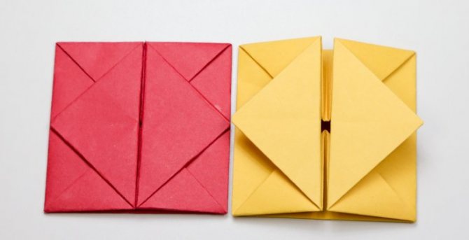 Сначала тебе нужно сделать из прямоугольника параллелограмм, как на схеме. Разверни его так, чтобы широкая диагональ ромба была его горизонталью. А дальше действуй по классической схеме – подогни все клапаны точно к центру.
