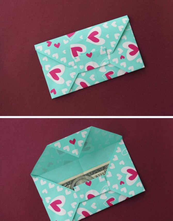 На базе этой простой модели, можно изготовить очаровательный конверт-оригами с бантом, который получится даже у новичков.