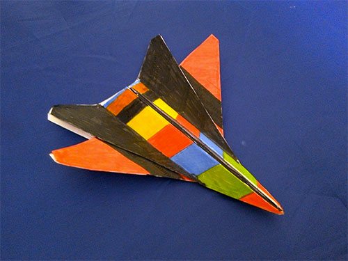 Расправь верхнюю часть узкого треугольника в ромб, как на схеме, и сложи его пополам вниз. Отогни угол обратно «лесенкой», сложи фигуру пополам и сформируй широкие крылья с небольшим уклоном. Такой самолет интересно смотрится из цветной бумаги за счет перехода цвета в носовой части.