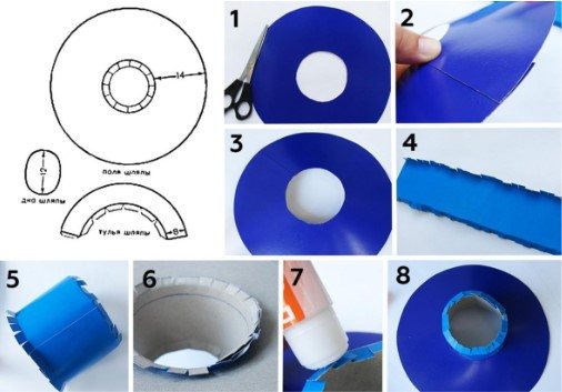 На кольце, которое необходимо приклеить, сделайте прибавку по внутренней окружности. Внешнюю окружность аккуратно вырежьте. Без припусков скроите дно шляпы.