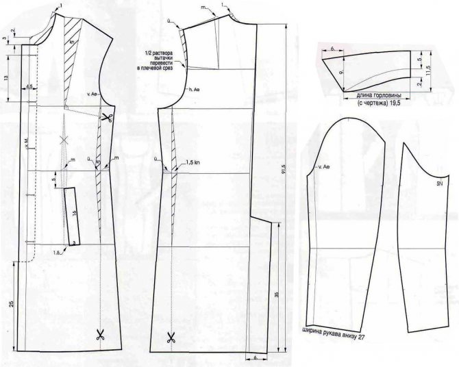 Для моделирования прямых изделий со спущенным плечом горловину расширяют, а на одношовных рукавах делается расширение и притачные манжеты. Плечевую точку необходимо поднять на сантиметр и увеличить на такую же величину ширину груди и спины. Нагрудная вытачка с плеча переносится в горловину, а плечевая уменьшается на сантиметр. Учтя все изменения, можно построить основу по индивидуальным размерам.