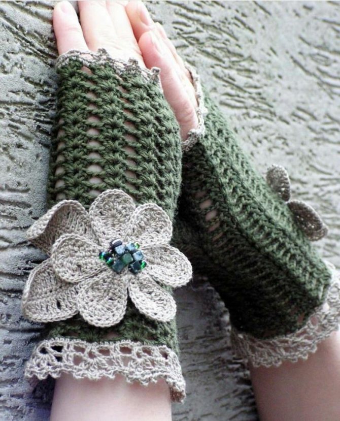 Связать второй экземпляр, симметрично первому. Митенки получаются простыми, но интересными. Их можно украсить цветочками, лентами или другими элементами.