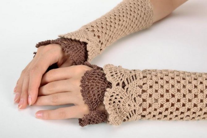 Если вы решили заняться вязанием митенок крючком для начинающих, следует помнить, что выполнение работы крючком отличается от вязания на спицах. Полотно, выполненное крючком, менее эластично, поэтому манжета растягивается хуже. Изделие получается более жестким и толстым.