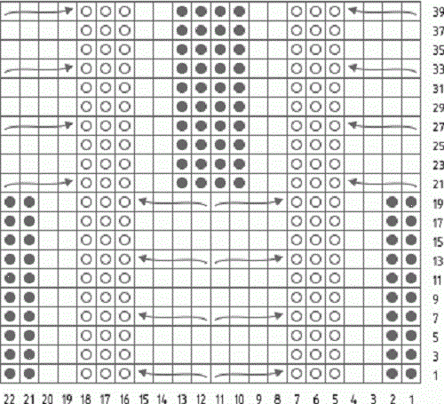 - Черный круг в квадрате – провязать изнаночными петлями в лицевых и изнаночных рядах;