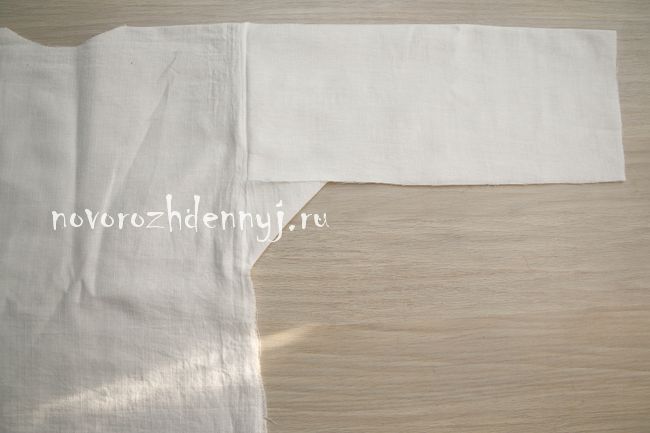 - Притачать детали рукавов к рубахе, совместив середины боковых сторон центрального полотнища рубахи и середину верхних срезов рукавов.