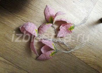 Теперь берём одну заготовку из трёх лепестков, пропускаем через неё проволоку с тычинками. Концы проволочек скручиваем между собой.