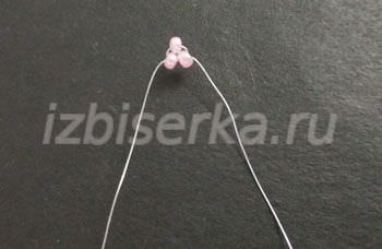- 1 и 2-й ряд: Берём отрезок проволоки – 110 см, нанизываем 3 розовых бисерины. Продвигаем бисеринки к середине, берём любой кончик проволоки, пропускаем его в обратном направлении через 2 бисеринки, затягиваем концы. У нас получилось первые два ряда.