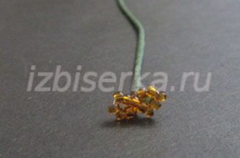 Чтобы приплести второй ряд, нужно на проволоку, которая ближе к лепестку нанизать 2 бисеринки. Верхний конец проволочки пропускаем через эти 2 бисерины, хорошо затягиваем.