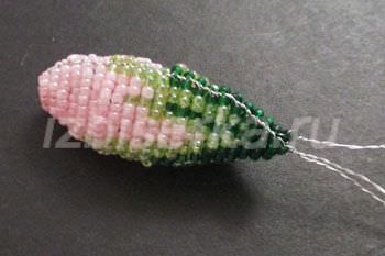 Бутон лилии плетётся точно так же как нераспустившийся цветочек. Рядов и количество бисеринок одинаковое, отличие только в цвете бисера. В первых пяти рядах используем светлый и тёмный оттенок зелёного.