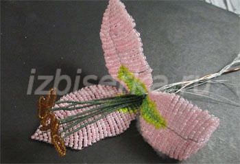 Для этого берём 110 см проволоки, продеваем её через верхнюю бисеринку на готовой половинке лепестка. Проволоку располагаем так, чтобы длина обоих концов была одинаковой. Дальше на оба конца нанизываем по 1 розовой бисеринке.