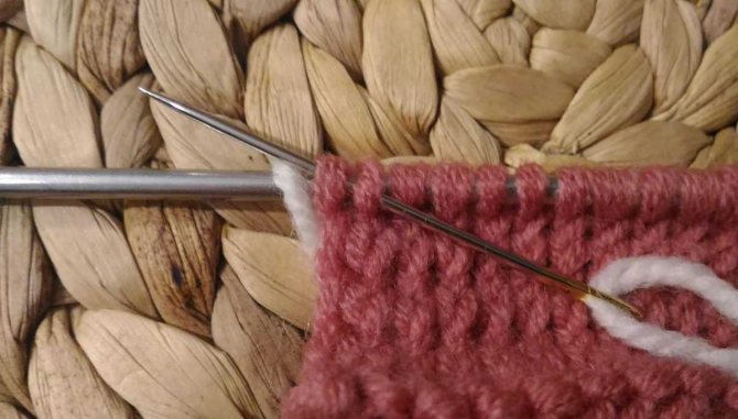 Закрытие петель выполняется по открытым петелькам. Для того чтобы они были довольно ровными и не могли распуститься, следует заканчивать вязание этой детали несколькими рядами, которые связаны дополнительной нитью. Обычно их количество колеблется от трех до десяти. Спицу из петель вынимают, край детали аккуратно надо проутюжить, используя влажную ткань. Теперь распустить ряды, которые были ранее связаны дополнительной ниткой. В иглу с большим ушком вдеть основную нить, которая осталась от вязания, выполнить аккуратный шов по всем открытым петелькам, а изделие для удобства расположить к себе лицевой стороной.