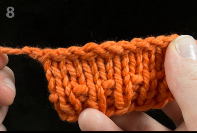 - Нить держите перед работой, свяжите следующую петлю изнаночной. Повторяйте предыдущие шаги до конца ряда. Проведите нить через последнюю петлю и затяните.