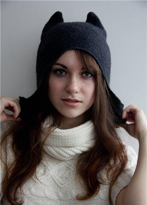 Еще одна забавная модель. По сути она связана по той же схеме, но пряжа достаточно мягкая и ушки обвисают. Вот такой грустный котик! Фасон на любой возраст от девушки до женщины постарше. Очень теплая, двойная, с подкладкой из акрила. Рассмотрим схему вязания женской шапки в стиле кошка на спицах.