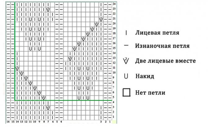 На схеме показаны лицевые ряды, а изнаночные вяжем по рисунку, накиды – изнаночными.