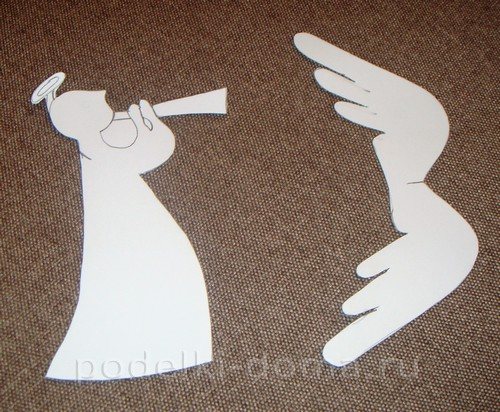 Берем обычную белую бумагу и рисуем на ней силуэт ангелочка в анфас, с дудочкой в руке. Отдельно рисуем крылья в размахе. Это будут трафареты.