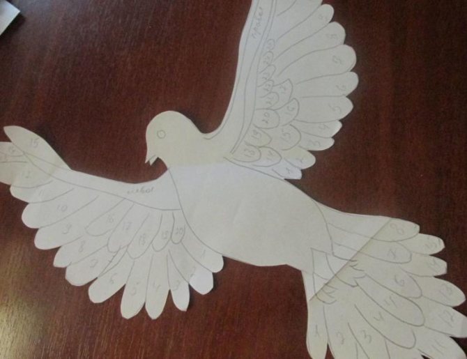 - Нарисуйте голубя карандашом на картоне. У меня получилась птичка размером примерно в 20 см. вырежьте картинку – она станет шаблоном.
