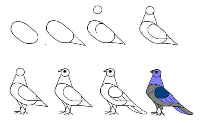 Еще вариант пошаговых действий для рисования голубя. Основа начинается с тела. Это большой овал, развернутый по диагонали. В верхней части у него выводится шея с головой, в нижней — хвост. Крылья раскрываются перпендикулярно телу.
