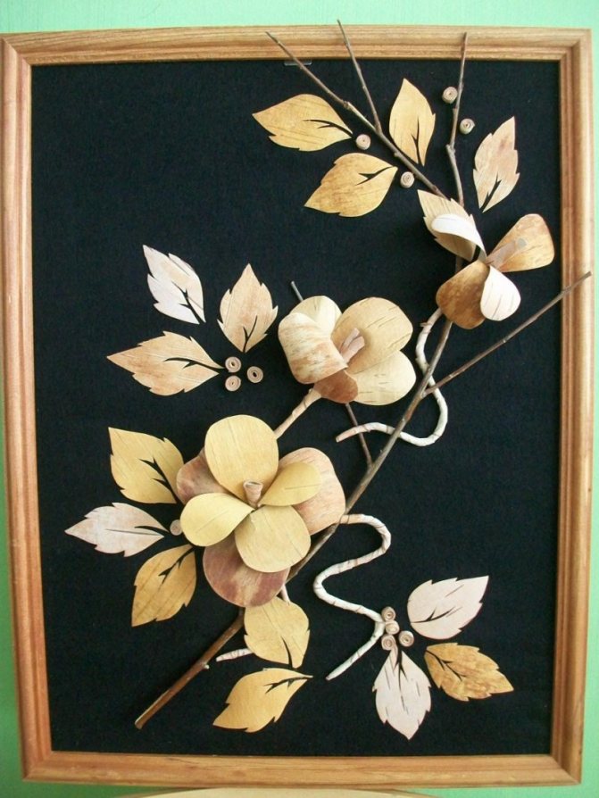 - Из берестяных ленточек накрутить цветочки, побеги и бутоны, приклеить их в соответствии с замыслом на основу.