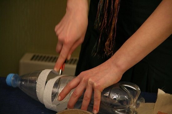 Вторую половину пластмассовых заготовок готовим так: отмеряем от горлышка вниз одну треть бутылки и приклеиваем по окружности клейкую ленту.