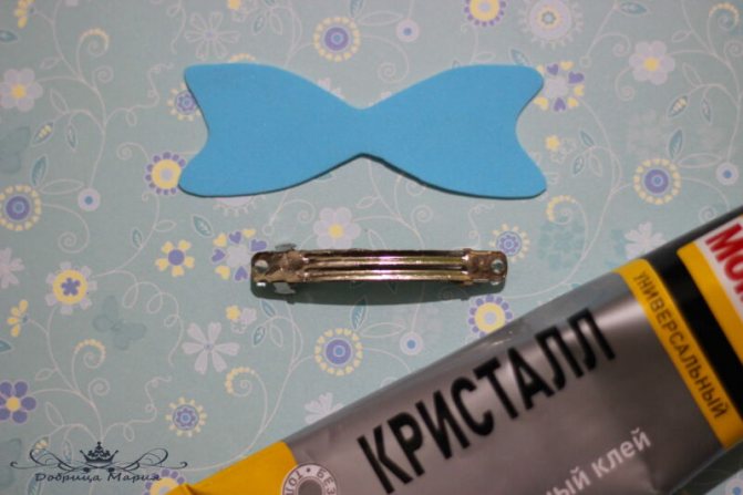 Для оборачивания бантика и резинки понадобится небольшая полоска фома, ее приклеиваем в круговую в стык.
