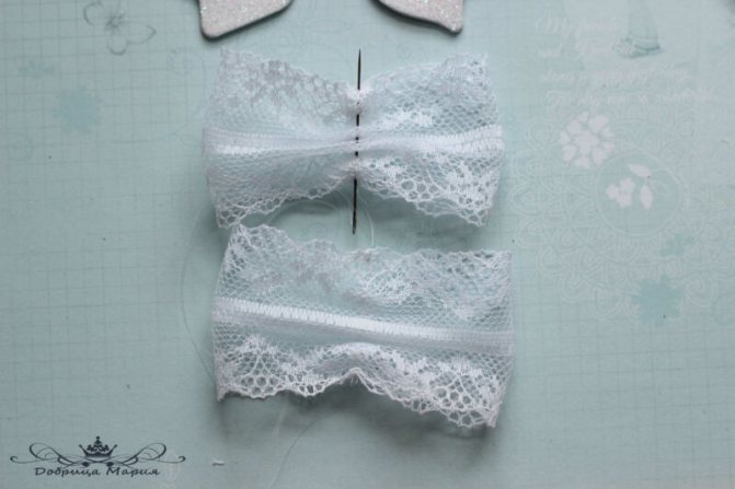 На 1 бант понадобится 2 полоски кружева по 15 см длиной и шириной 4 см.