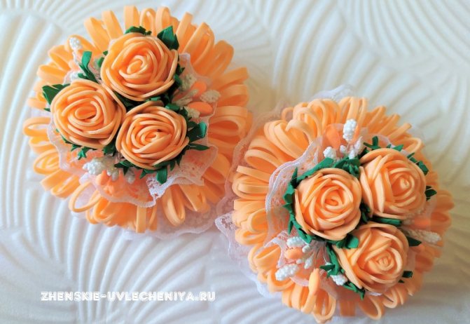 Маленькие розочки легко создать, но они смотрятся эффектно и делают украшение объемным. Дополнительную пышность придает кружево. В качестве основы можно взять зажим, резиночки, обруч для волос. А если хотите сделать аксессуар для малышки, то подойдет мягкая повязка-резинка на голову. Расход материалов небольшой, для некоторых деталей сгодятся обрезки.