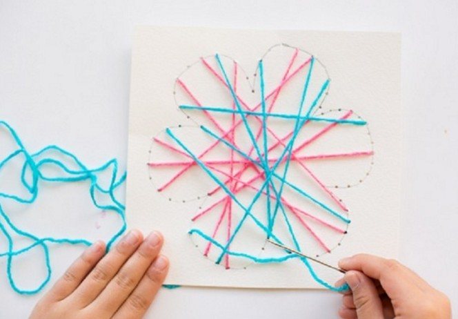 2. Далее по контуру нужно будет шилом или иголкой проделать отверстия. Нитку вставьте в иголку и начните творить. Проделайте узоры от одного лепестка к другому.