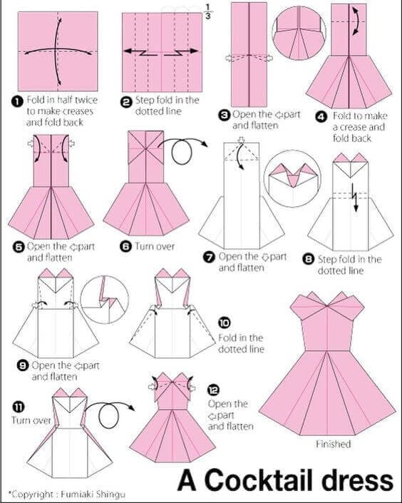 Очень популярны сейчас поздравительные идеи с декором в виде платьев. Их можно просто вырезать из салфеток или бумаги. А можно свернуть в стиле и, ниже дам схему.