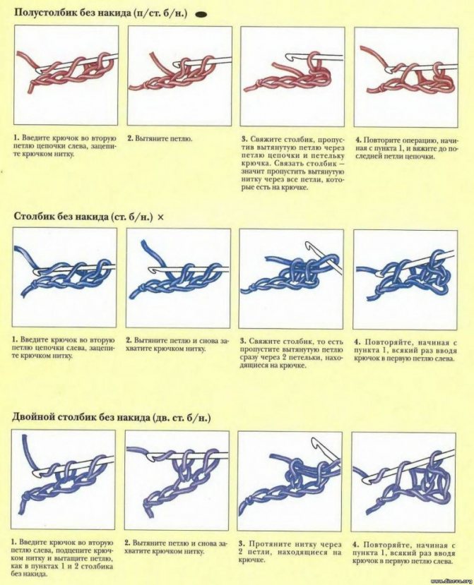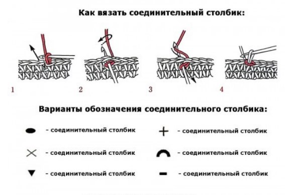 Соединительный столбик, как уже понятно из его названия, служит для соединения ряда вязания, его частенько называют соединительной петлей. Полустолбик и полустолбик без накида вывязываются в середине полотна и частенько соединяют, например, цепочки из воздушных петель с основным рядом.