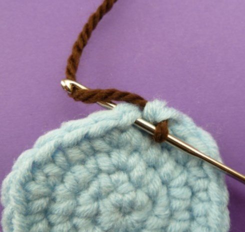 При вязании разными цветами бывает необходимо ввести нить другого цвета, чтобы переход не был заметен на полотне. Для этого довязываем ряд до последнего столбика и в месте соединения с началом ряда делаем соединительный столбик нитью другого цвета.