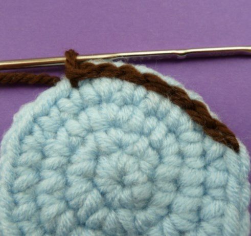 Далее создаём полустолбики во всех воздушных петельках, пока не дойдём до завершения ряда. Здесь одну петлю используем для реализации подъёма, переворачиваем изделие и вводим крючок под нити одной из петель предыдущего участка. В результате получаем нужный нам полустолбик.